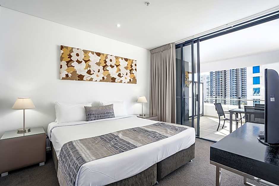 Located between level 12 and 30, this apartment offers a lounge area and a bedroom opening onto a private balcony offering ocean and hinterland views. There are 2 bathrooms with separate shower and bathtub. WiFi access is free. 1 car space per apartment is offered.